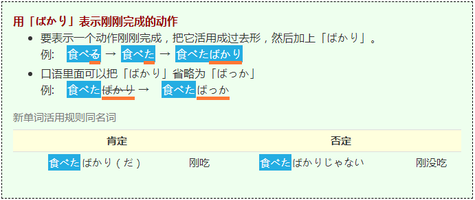 这个语法很有用,用来表示某人刚刚完成了某个动作。比如以前当我刚吃了东西而想礼貌拒绝别人请我吃东西时,就特希望会说这个语法。你只需要把你刚刚完成的动作换成过去形,然后加上「ばかり」。这里只能用过去形,另外要注意不要跟前面讲数量时候介绍的「ばかり」混淆了。