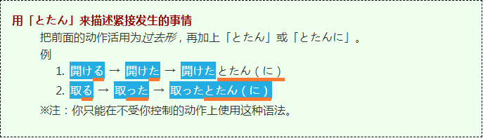 这种语法需要在先发生的那个动作的过去形后面加上「とたん」。另外大家也经常加上目标助词「に」来表明那个特定的时间点。
