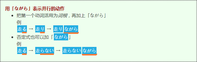 你可以用「ながら」来表达两个同时进行的动作。用「ながら」的时候,必须把第一个动词活用为词根,再加上「ながら」。你也可以把「ながら」加到动词否定式后面来表示否定,不过很少人这么用。这个语法的时态取决于第二个动作。