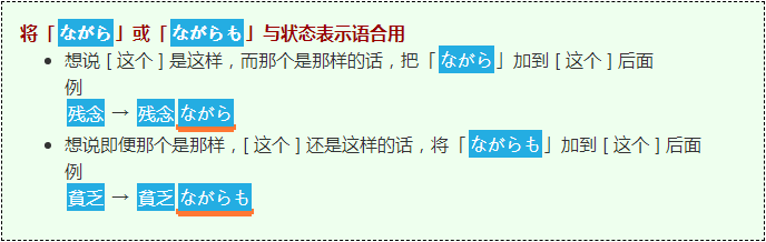 你也可以把表示包含的助词「も」加到「ながら」后面变成「ながらも」。这时候它的意思就从「当」变为了「即便当」。