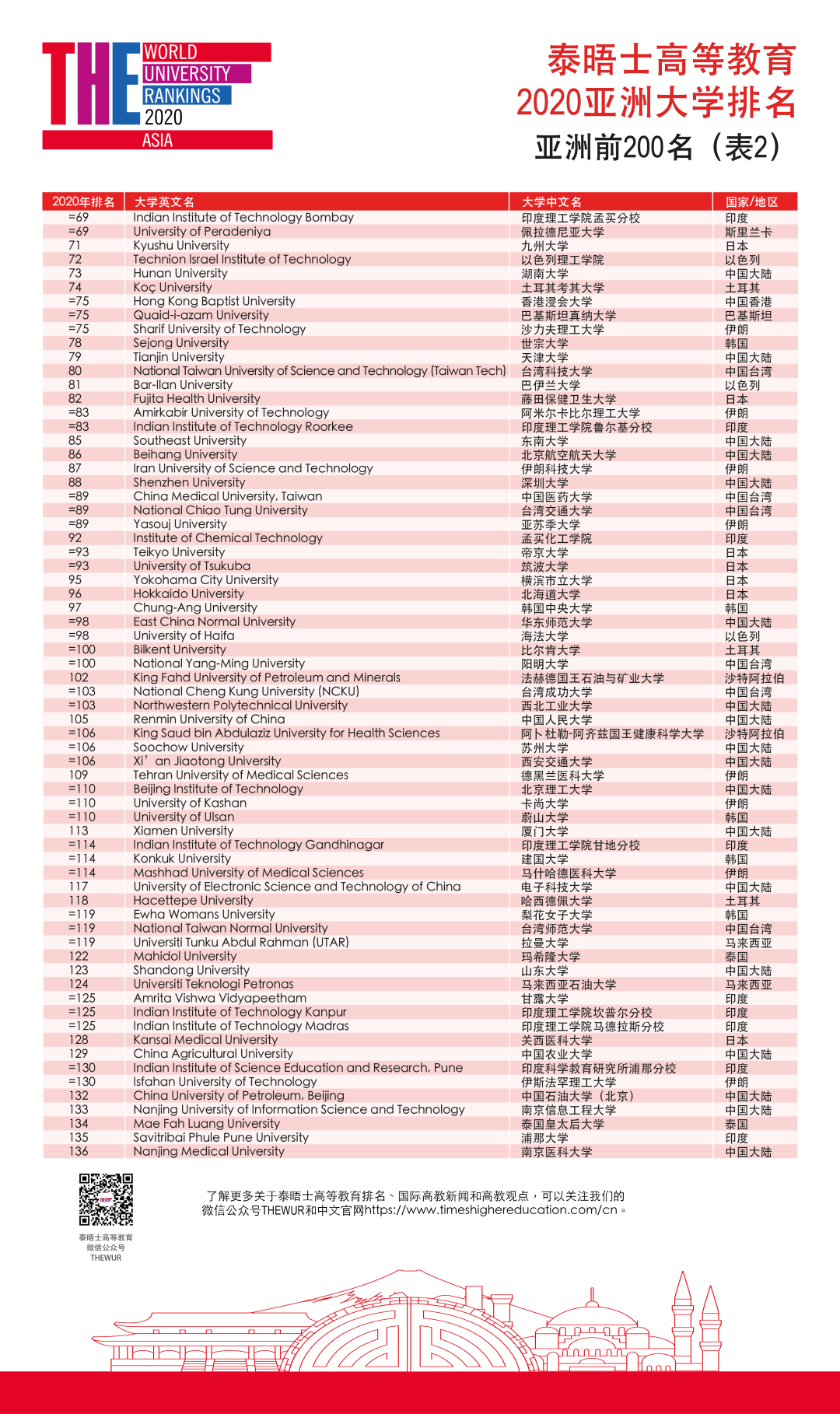 2020年的排名包括来自30个亚洲国家的近500所大学。